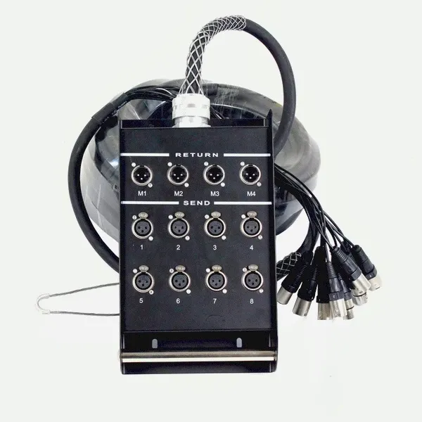 Мультикор DB0804/20M от компании Invotone применяется для коммутации оборудования на сцене, что значительно экономит время и силы, затрачиваемые на прокладку тех же соединений одиночными проводами. К тому же вместо 12 раздельных кабелей по полу проходит один аккуратный кабель, разгружая пространство сцены или студии. Лицевая панель черной распределительной коробки оснащена маркированными восемью XLR female разъемами и четырьмя XLR male (возвратными) разъемами. Кабель длиной 20 метров оканчивается двенадцатью XLR коннекторами.Характеристики и возможности