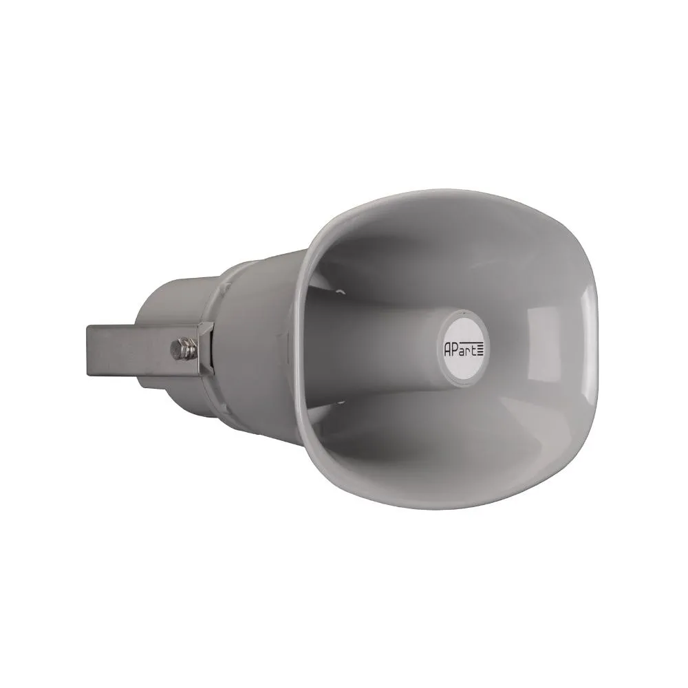 APART H30LT-G — мощный компрессионный рупорный громкоговоритель промышленного назначения. Это идеальное решение для воспроизведения речи и передачи сигналов тревоги на большие расстояния в помещениях и на открытом воздухе. Даже при повышенном уровне фонового шума вас услышат — громко и четко.Громкоговоритель APART H30LT-G изготовлен из ударопрочного пластика ABS, а прилагаемый к нему монтажный кронштейн выполнен из нержавеющей стали во избежание коррозии. Форма рупора обеспечивает широкий угол покрытия в горизонтальной плоскости.