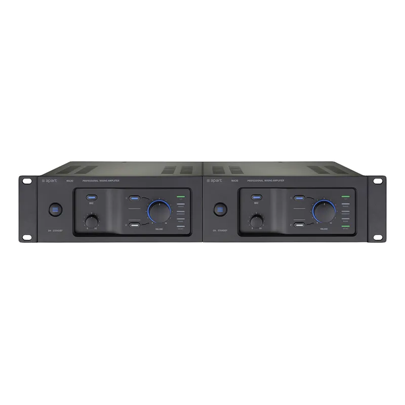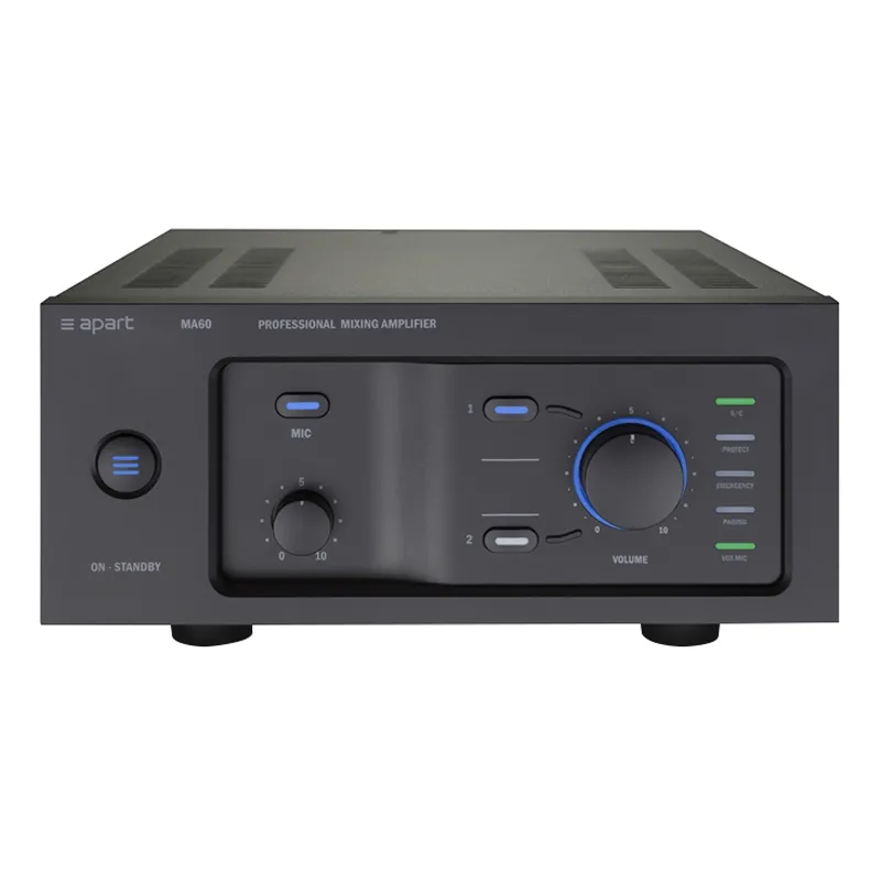 Ультрасовременный микшер-усилитель Apart MA60 отличается интуитивно понятным набором органов управления на передней панели и необычной, но аккуратной и логичной компоновкой задней панели.Поворотный регулятор общей громкости визуально подчеркнут за счет увеличенного диаметра и подсветки, а регуляторы громкости микрофонов меньше по размерам и расположены в углублении панели. Микшер, заключенный в компактный корпус шириной 9,5 дюйма, оснащен одним универсальным микрофонно-линейным входом и двумя стереофоническими линейными входами с возможностью монофонического суммирования.