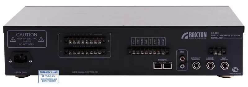 ROXTON SX-480 — комбинированная система оповещения, объединяющая функции музыкального трансляционного усилителя, блока цифровых сообщений и автоматического контроля линий. К нему можно подключить до 4 микрофонных консолей ROXTON SX-R31 с разными приоритетами. Консоли управляют 5 зонами и транслируют сообщения через микрофон. Музыкальный модуль с FM-тюнером и аудиодекодером поддерживает форматы mp3, wma. Управление через прибор или пульт. Питание от сети 220 В.