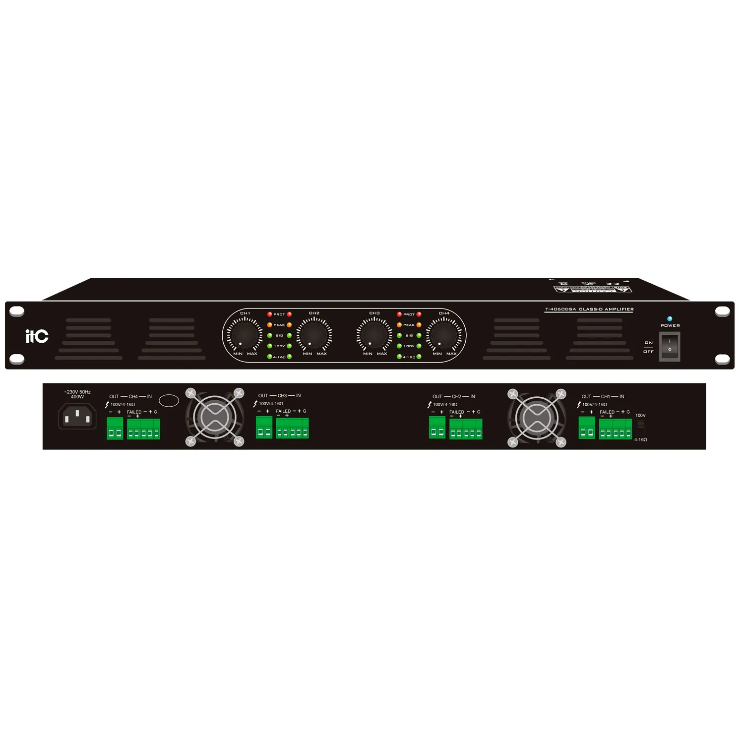 ITC T-4120DSA - профессиональный четырехканальный усилитель мощности, рассчитанный на работу с трансляционными громкоговорителями на 100 В и с низкоомными на 4-16 Ом. Устройство может использоваться для систем оповещения и воспроизведения фоновой музыки в торговых центрах, складах, ресторанах и барах, в бюджетных и образовательных учреждениях, развлекательных центрах и в офисах.ITC T-4120DSA обеспечивает выходную мощность по 120 Вт на каждый канал. Рэковый корпус усилителя выполнен из прочного металла и имеет высоту 1U. На его лицевой части расположены четыре регулятора выходного уровня громкости для первого, второго, третьего и четвертого каналов. Рядом с ними имеются индикаторы выбранного выходного режима, перегрузки и ухода устройства в защиту. Усилитель оснащен защитой от короткого замыкания, перегрузки и перегрева.