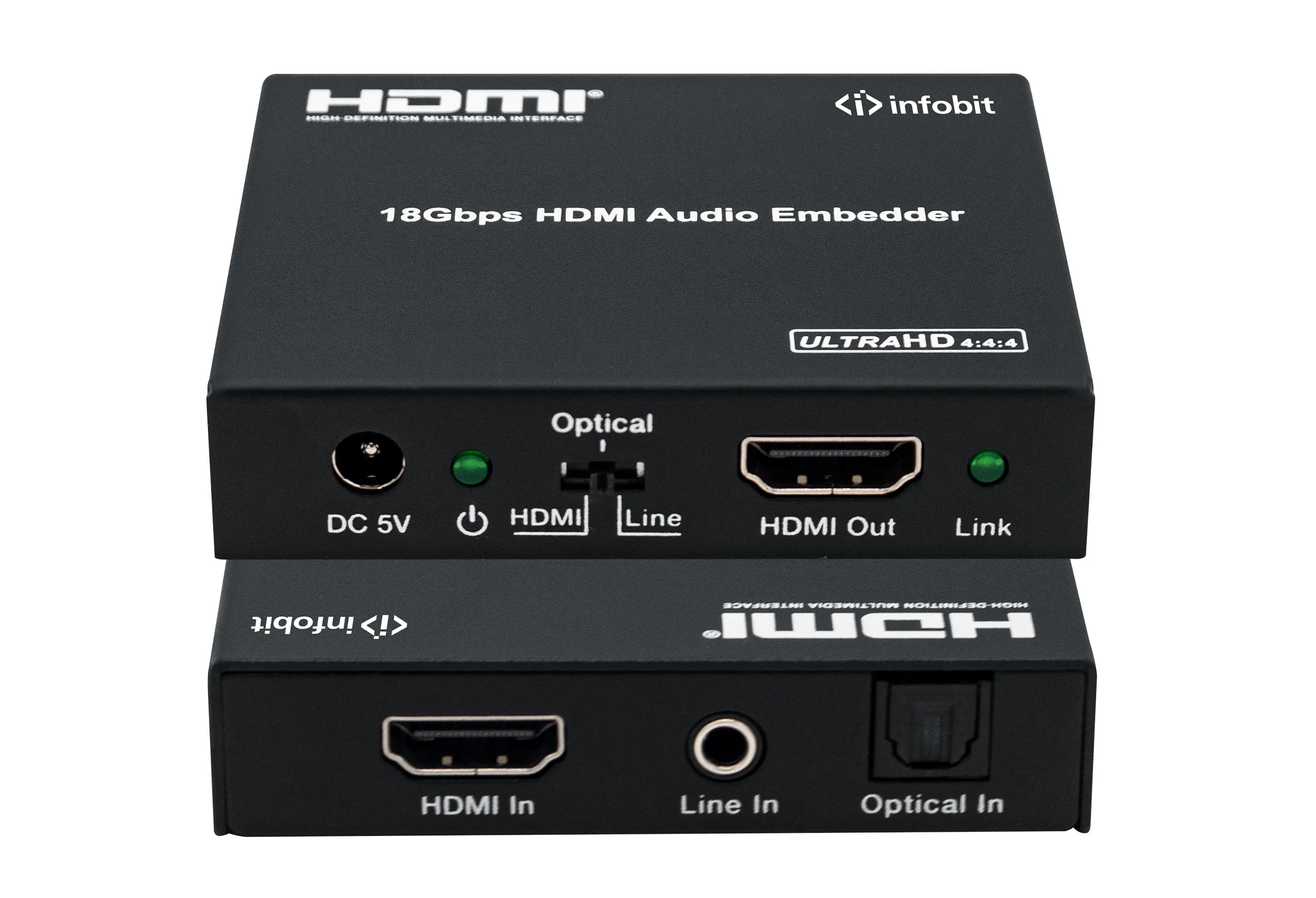 Эмбеддер HDMI Infobit iTrans AE01Infobit iTrans AE01 — это устройство, которое интегрирует аудиосигналы из цифрового оптического или аналогового источника в HDMI-выход. Поддерживает видео до 4K2K при 50/60 Гц, 10-битный HDR и передачу аудиоформатов высокого разрешения, включая Dolby Atmos и DTS-HD Master Audio. Совместим с HDCP 2.2 и DVI 1.0.