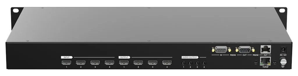 Устройство поддерживает HDMI 4x4 с разрешением 4K 60 Гц и пропускной способностью 18 Гбит/с. Соответствует стандарту HDMI 2.0. Есть де-эмбеддер 4x и аудиоматрица. Доступны интерфейсы RS232, IR, TCP/IP с GUI.
