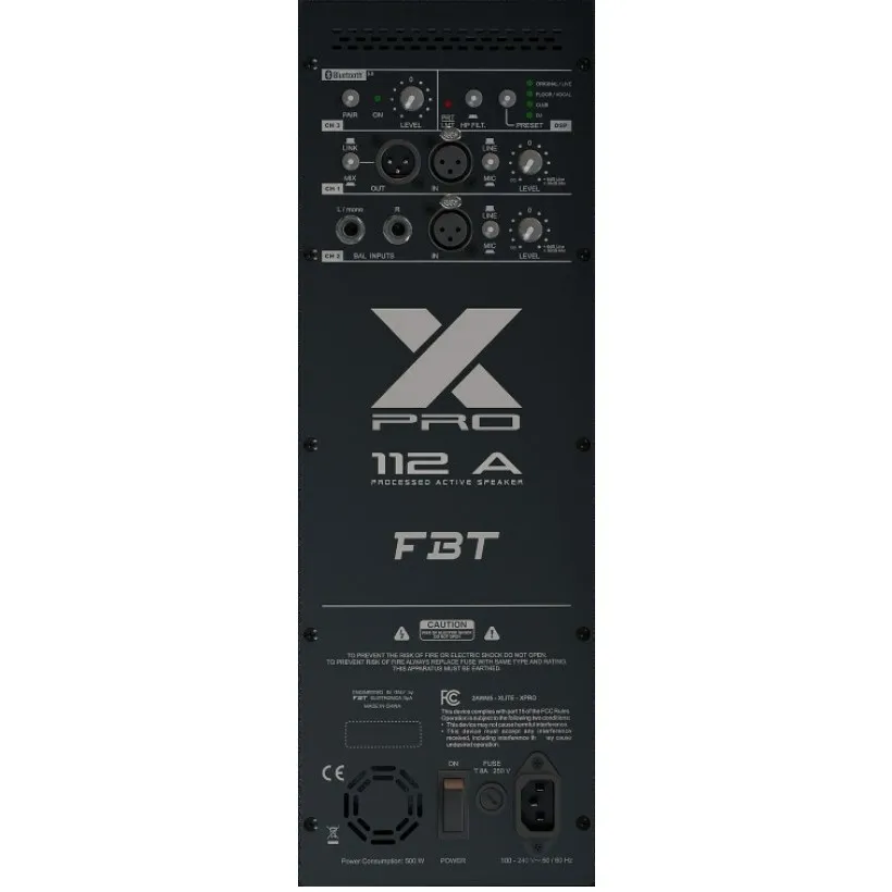FBT X-PRO 112A — активная акустическая система с 12-дюймовым НЧ-динамиком и 1-дюймовым ВЧ-драйвером. Частотный диапазон — 50 Гц–20 кГц. Уровень звукового давления — 129 дБ.
