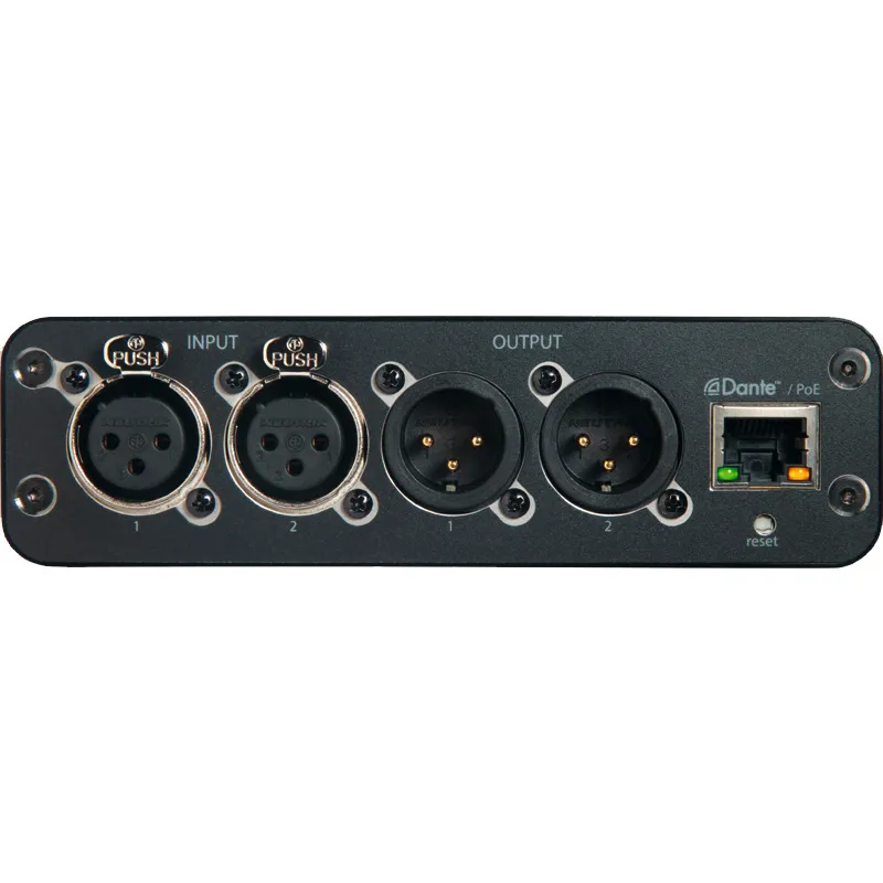 Аудиоинтерфейс Shure ANI22-XLR преобразует аналоговые сигналы в Dante-сеть и обратно. Модель оснащена XLR разъёмами (2 входа/выхода). Поддерживает удалённое управление через браузер. Питание через PoE. Компактный корпус.