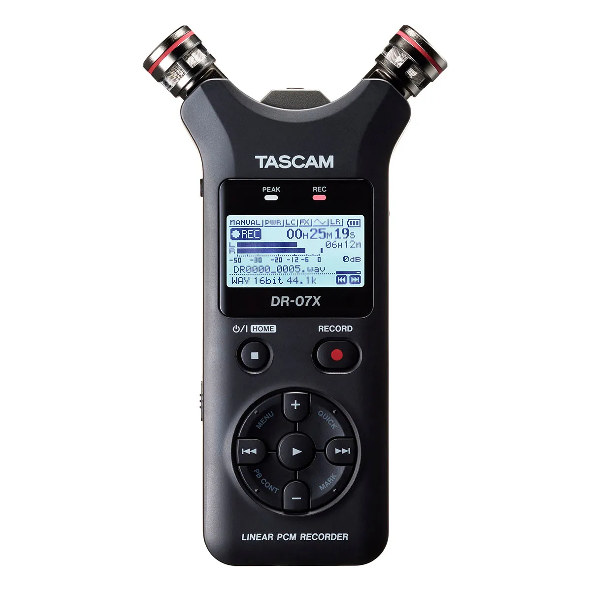 Tascam DR-07X — устройство для внестудийной аудиозаписи. Оснащено аудиоинтерфейсом и конденсаторными микрофонами с настройкой ориентации AB/XY для качественного стереозвука. Работает с microSD до 128 Гб, имеет готовые эффекты, включая реверберацию. Поддерживает Windows и Mac.