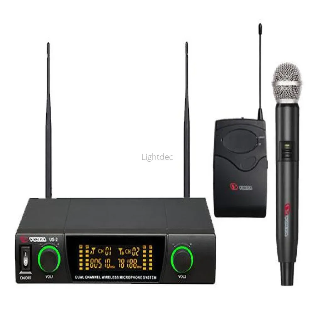 VOLTA US-2X — микрофонная радиосистема с ручным и головным микрофонами UHF диапазона. Есть LCD-дисплей, True Diversity, Plug&play. В комплект входят поясной (490.21) и ручной (629.40) передатчики.