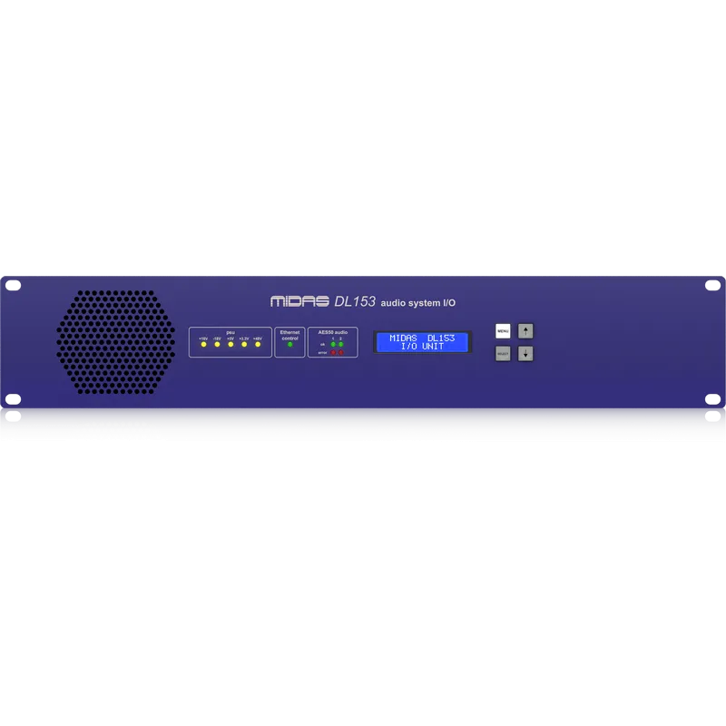 MIDAS DL153 — это аудиоинтерфейс с 16 дистанционно управляемыми микрофонными предусилителями. Предусилители работают от фантомного питания +48 В. Предусмотрена регулировка усиления от -2,5 до +45 дБ с шагом в 2,5 дБ. Частота семплирования — 96/48 кГц. Входные/выходные терминалы оснащены балансными XLR-разъёмами. На задней панели — 8 линейных аудиовыходов. Двойные сетевые порты AES50 от Neutrik со светодиодной индикацией. Устройство можно установить в рэковую стойку 2U.