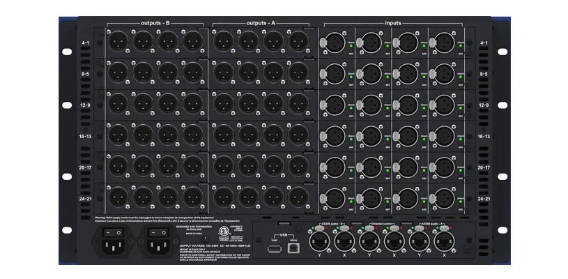 На задней панели — две группы симметричных аналоговых выходов, на передней — третья группа трансформаторно-изолированных выходов с фиксированным усилением для записи или вещания. Особенности: локальный мониторинг, встроенный усилитель для наушников, двойное резервирование блока питания.