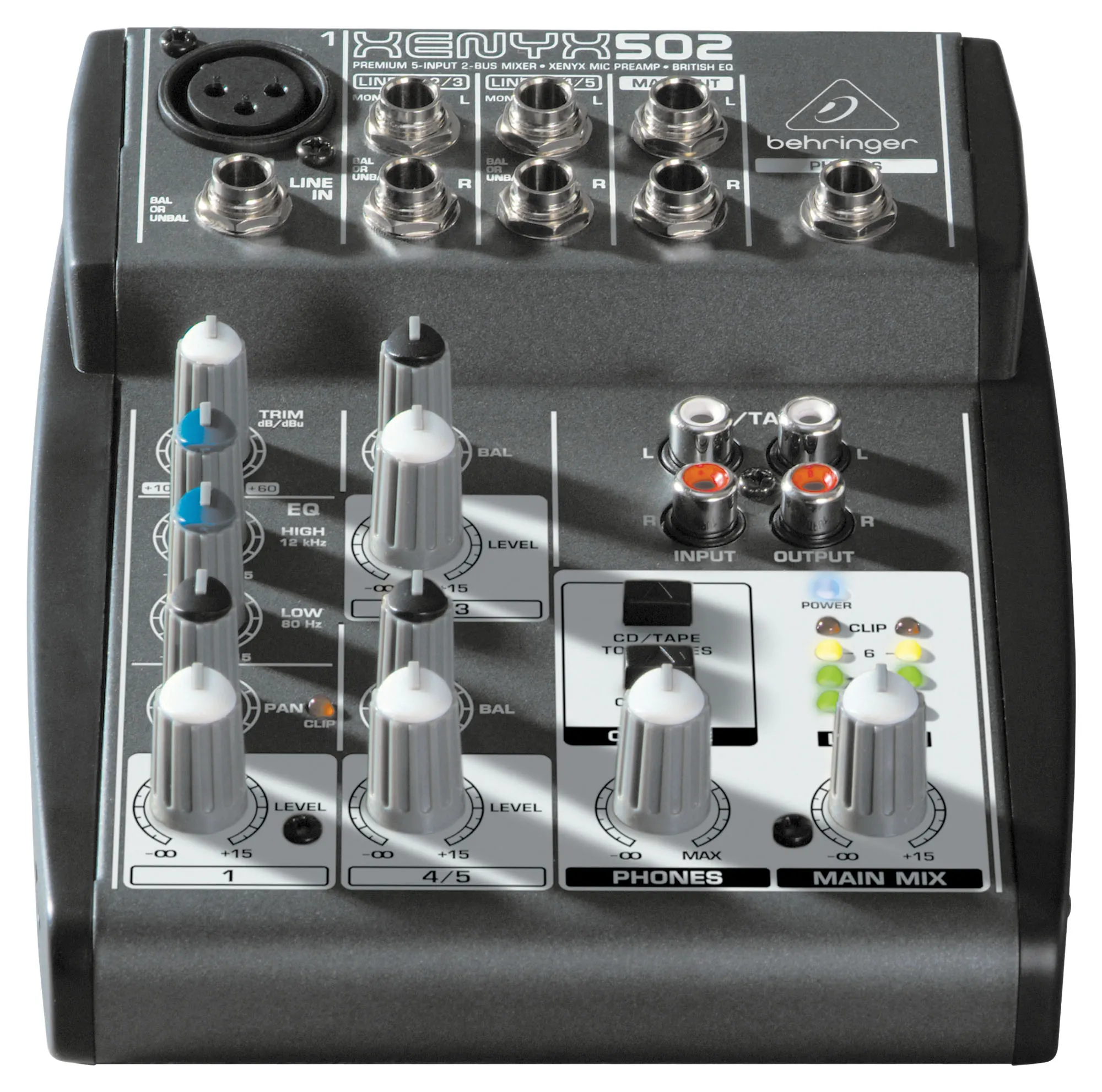 XENYX 502 имеет 5 входов, выходы основнного микса, стереовыход на наушники и CD/tape. Также предусмотрены назначаемые дополнительные входы CD/tape для гибкой маршрутизации.