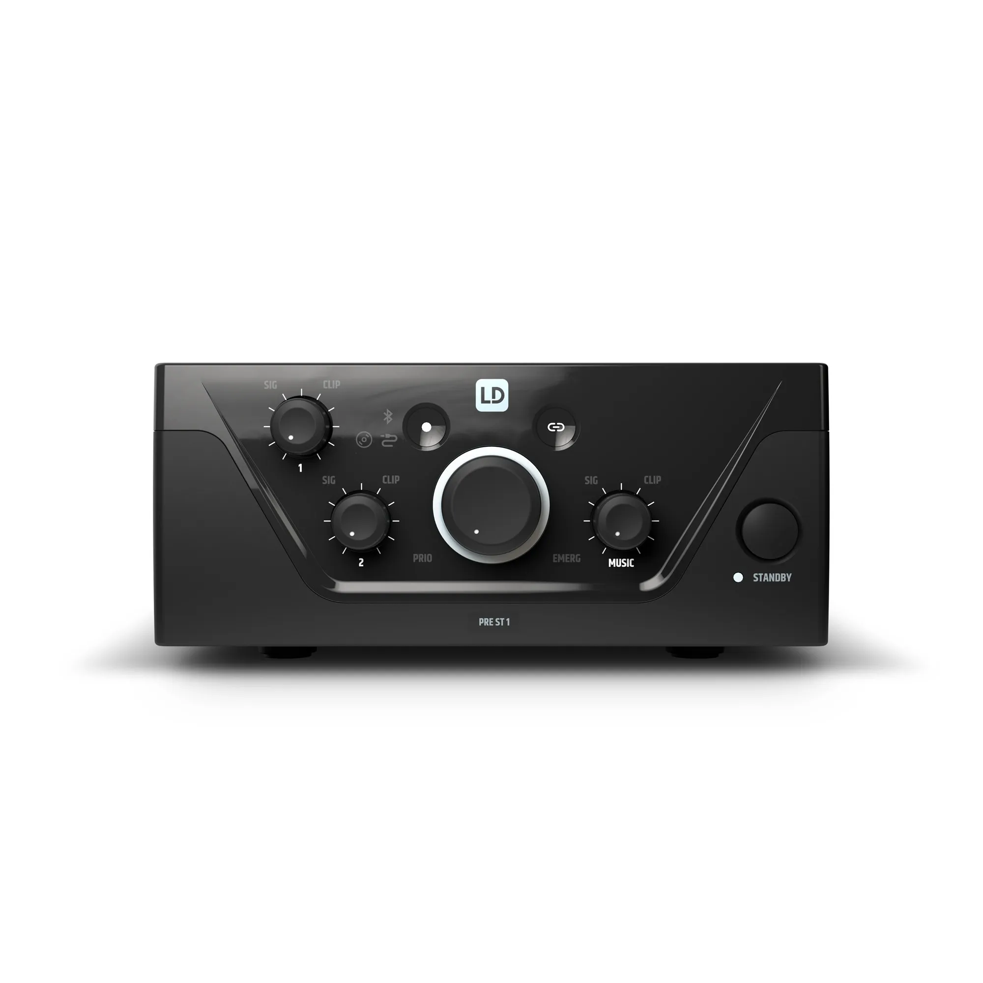 PRE ST 1 имеет линейный вход для системы оповещения, два микрофонных/линейных входа, музыкальные источники (два стереолинейных входа и Bluetooth v. 4.0). Устройство также оснащено регуляторами усиления, светодиодными индикаторами, линейным выходом для подключения усилителя или внешних музыкальных систем. Предусмотрен автоматический режим Standby для уменьшения энергопотребления.