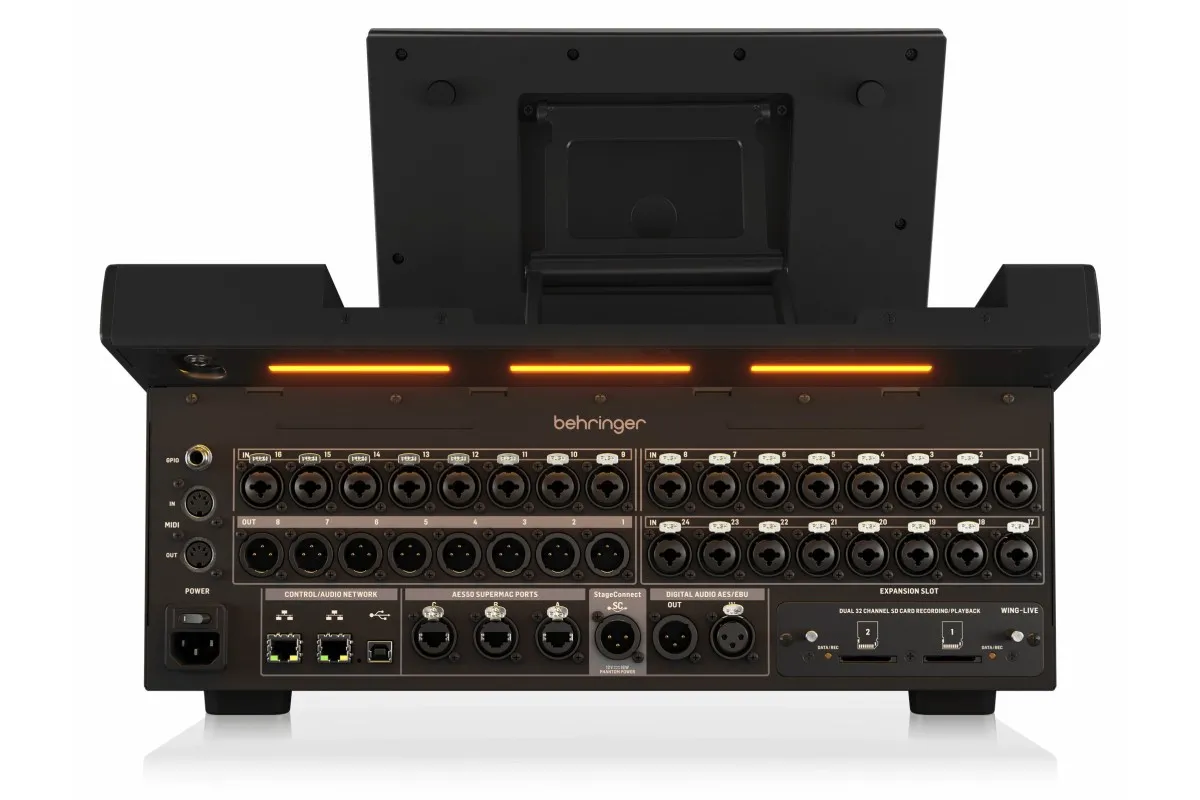 - Слот расширения на задней панели может вмещать опциональный 64-канальный аудиоинтерфейс и сетевые карты расширения, например, Dante, WSG, MADI…