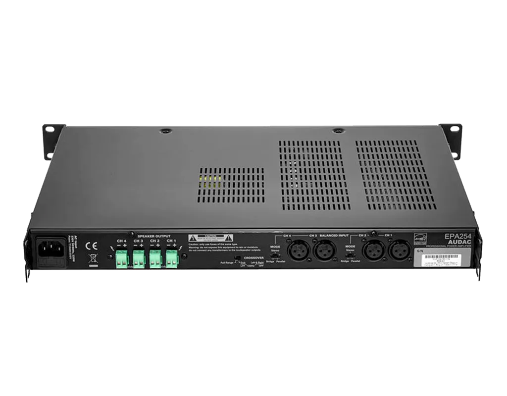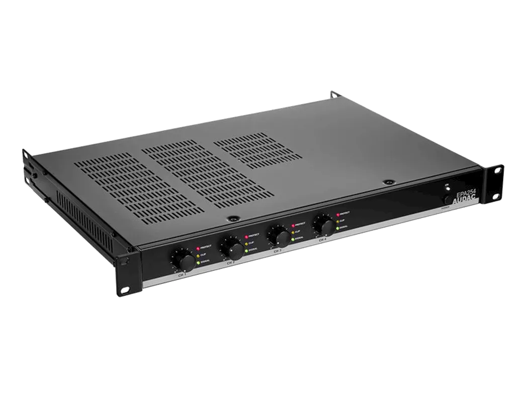 Audac EPA254 — энергоэффективный стереоусилитель мощности с 4 входами XLR. Использует технологию класса D для высокой эффективности и качества звука. Оснащён системой защиты от перепадов тока, короткого замыкания, перегрева и перегрузки. Режимы работы: мостовой, стерео, параллельный. Есть отключаемый кроссовер 120 Гц.